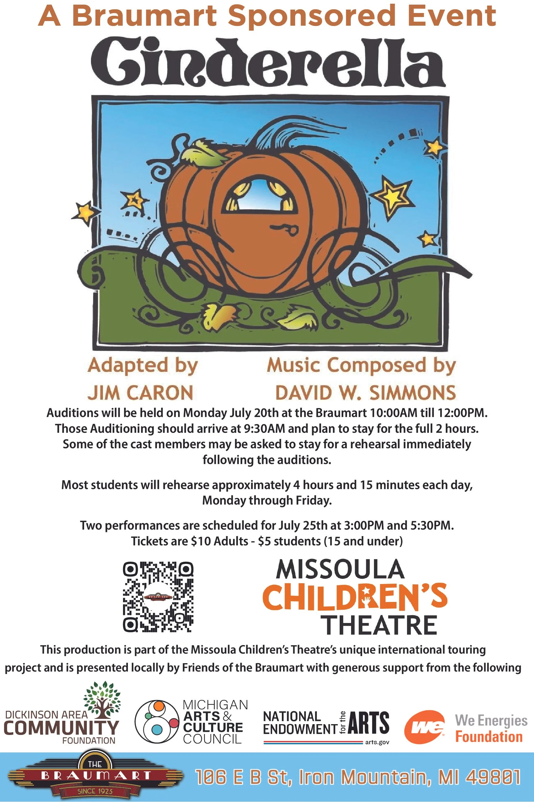 This production is part of the Missoula Children's Theatre's unique international touring project and is presented locally by Friends of the Braumart with generous support from the following: Dickinson Area Community Foundation, Michigan Arts & Culture Council, National Endowment for The Arts and We Energies Foundation.